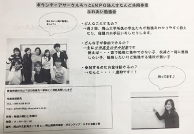 ふれあい勉強会(岡大生が無料で勉強教えます!) 毎週2回、火曜日と木曜日の午後6時から9時まで好きな時間で参加いただけます。 小学生から高校生までの方が対象です。どんなにわからなくても大学生がマンツーマン形式で丁寧に教えます。 岡山市北区南方2丁目13-1 岡山県総合福祉・ボランティア・NPO会館2階にて開催