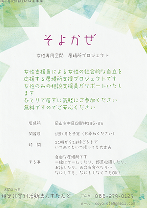 女性支援員による女性の社会的な自立を応援する居場所支援プロジェクトです